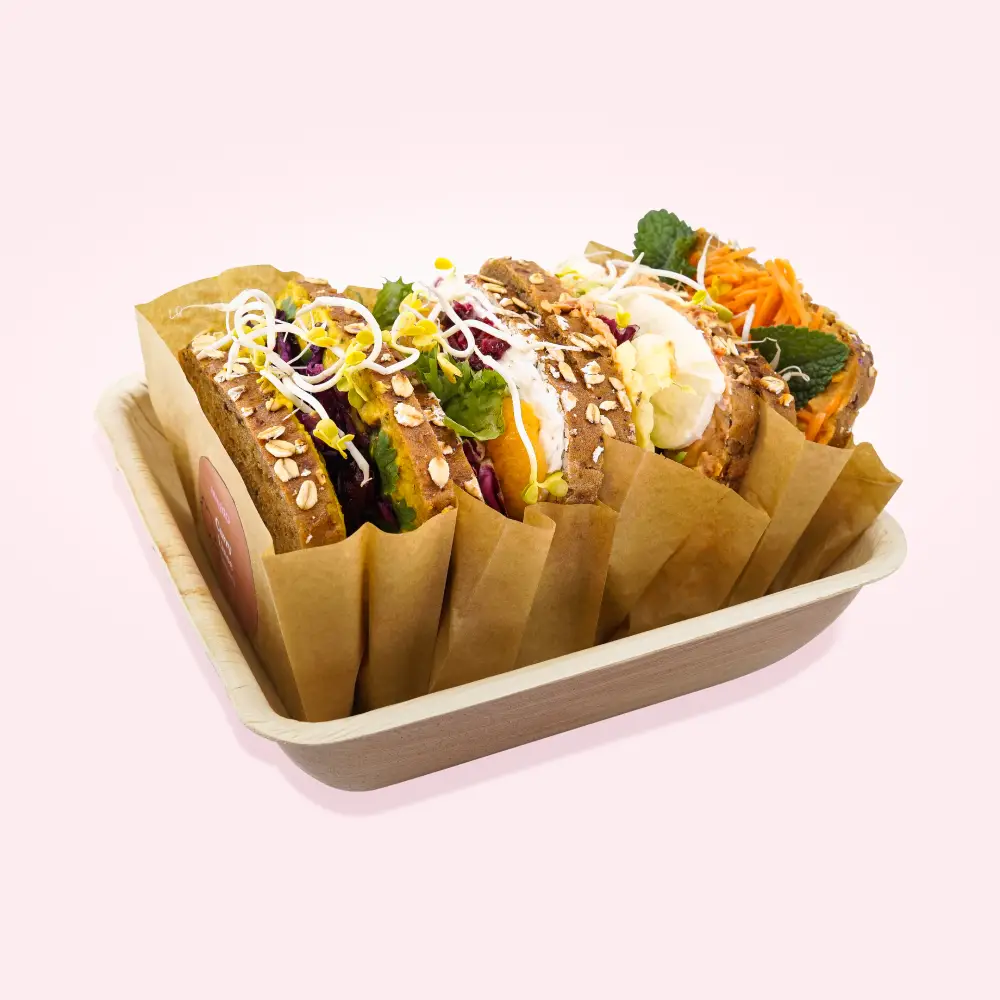 aveato utilizza una vasta gamma di soluzioni di imballaggio Green Box, tra cui imballaggi avvolgenti e sacchetti piatti di carta, in cui i panini freschi possono essere confezionati in modo sicuro e consumati senza gocciolare. I vassoi in foglia di palma non solo consentono di servire facilmente frutta, finger food o pasticcini. La gamma di prodotti in foglia di palma naturale è anche molto accattivante, valorizza visivamente ogni buffet e sottolinea la mentalità sostenibile del catering aziendale.