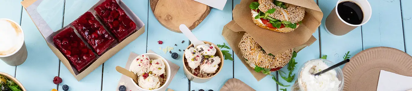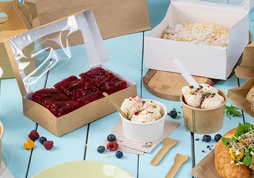 Nelle caffetterie e gelaterie sono essenziali imballaggi adeguati per diversi cibi e bevande. Oltre ai bicchieri, fanno parte dell’equipaggiamento anche confezioni per snack, scatole per torte, bustine di zucchero e palette. Che si tratti di panini farciti, fette di torta, offerte per la colazione o snack da asporto: robuste scatole per torte garantiscono il trasporto sicuro di dolci e snack.